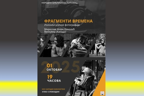 U Narodnoj biblioteci Ćićevac će sutra u 19 časova biti svečano otvorena izložba ulične fotografije pod nazivom „Fragmenti vremena”, autora Miroslava Mira Nikolića iz Vankuvera (Kanada)