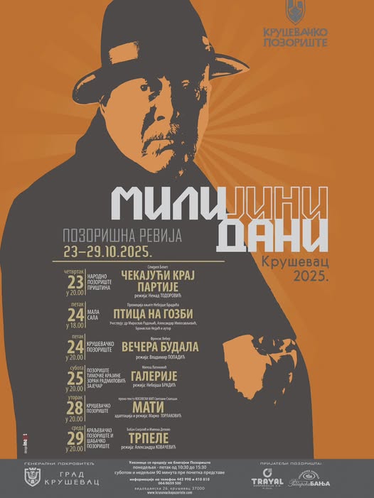 Od sutra u Kruševačkom pozorištu počinje pozorišna revija „Milijini dani“, posvećenao preminulom kruševačkom glumcu Miliji Vukoviću. Manifestacija, koja čuva sećanje na jednog od najomiljenijih glumaca lokalne scene, trajaće od 23. do 29. oktobra i okupiće ansamble iz više pozorišta širom Srbije