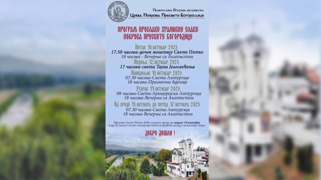 Od srede do petka Sveta liturgija će se služiti od 7:30, dok će večernje sa akatistom počinjati u 18 časova. Vernici su pozvani da prisustvuju bogosluženjima i zajednički proslave zaštitu i milost Presvete Bogorodice.