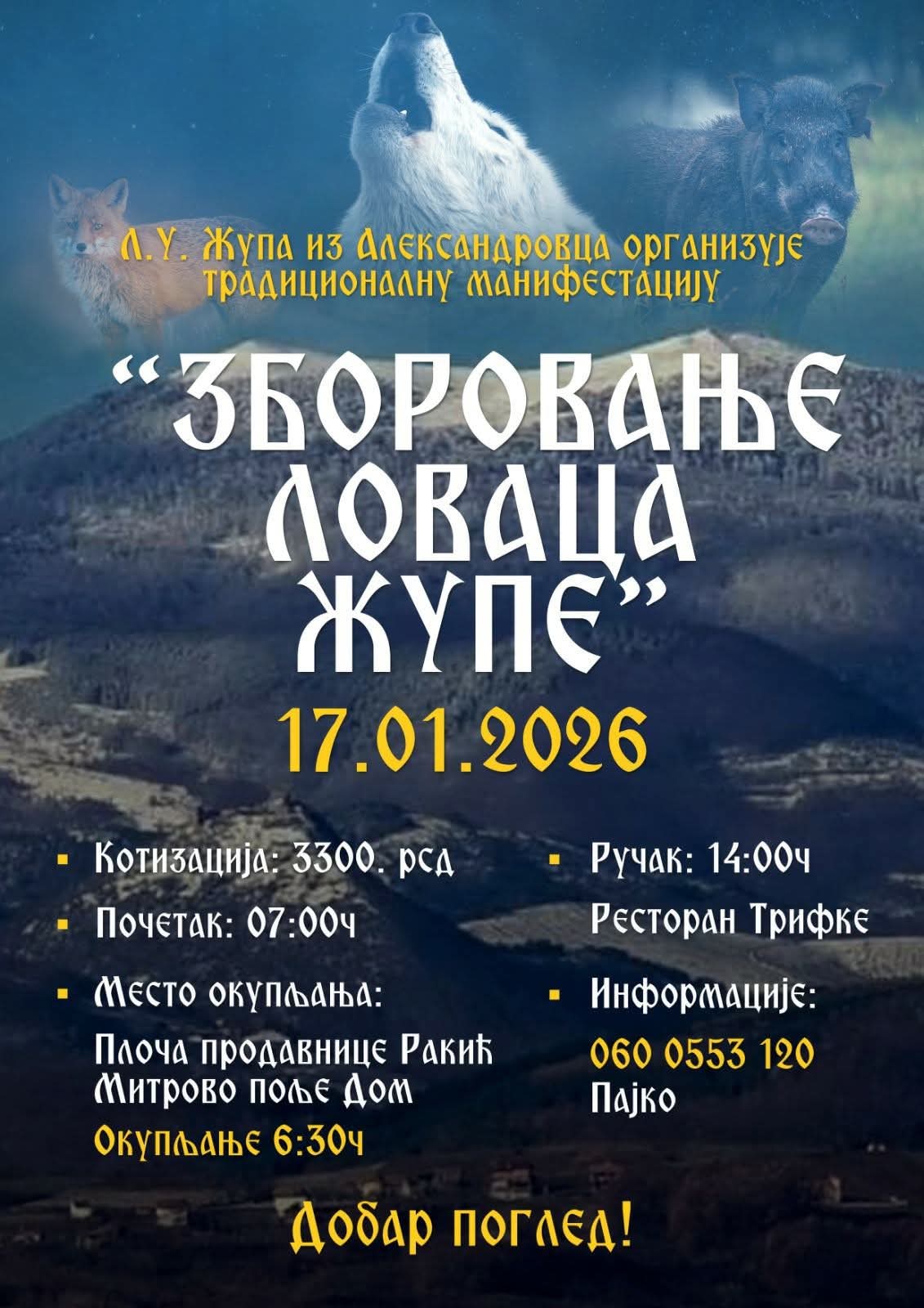 Lovno udruženje Župa iz Aleksandrovca organizuje tradicionalnu manifestaciju „Zborovanje lovaca Župe“, koja će se održati u subotu, 17. januara 2026. godine