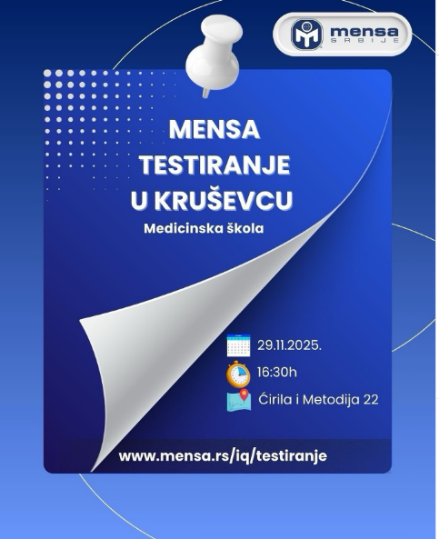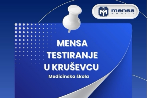 U Kruševcu će u subotu, 29. novembra biti organizovano zvanično Mensa testiranje inteligencije. Testiranje će početi u 16:30 časova u prostorijama Medicinske škole