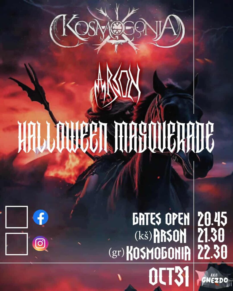 Večeras se u „Gnezdu“, uz standardno veselje koje kod poklonika izaziva Noć veštica (Halloween), održava i zanimljiva internacionalna rok svirka – uz domaći sastav Arson nastupiće i popularna grčka ekipa Kosmogonia. Velika žurka na Rasini počinje od 20.45
